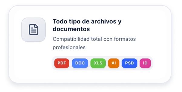Todos tus archivos. Sin caos. Guarda cualquier formato: PDF, imagen, Word, Excel, Illustrator, Photoshop, ZIP…
